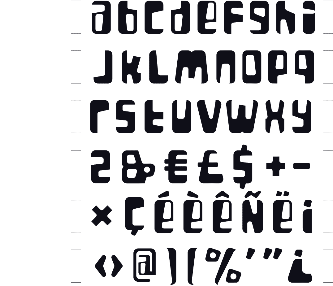 [2000] The inspiration for this font came while I was working on a logo, playing with a black rectangle with rounded corners, from which white rounded shapes are cut out. In the end, I didn’t make a logo that way, but I did end up making a font that consists of shapes instead of lines. The font has a pop-art look that gives it a special sixties feel.